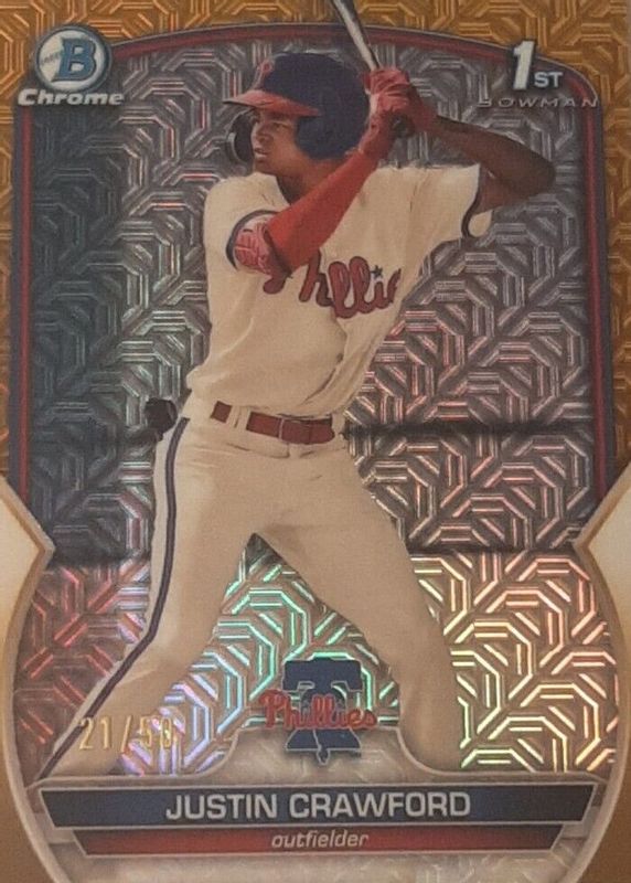 The Justin Crawford 2023 Bowman Mega Box #BCP-3 Chrome Prospects - Gold Mojo Refractor /50 (1st) card in Raw condition has not changed in price in the last 30 days and was last sold for $70.00 .