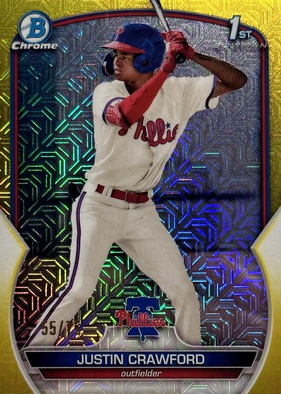 The Justin Crawford 2023 Bowman Mega Box #BCP-3 Chrome Prospects - Yellow Mojo Refractor /75 (1st) card in Raw condition has not changed in price in the last 30 days and was last sold for $26.50 .