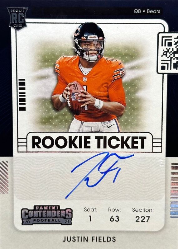 This card is 1 of 10 Justin Fields' card variations in the 2021 Contenders set being tracked by Sports Card Investor, including Rookie Ticket Auto Variation, Rookie Ticket Auto - Red Zone Ticket, Rookie Ticket Auto - Ticket Stub (/1), Rookie Ticket Auto - Wild Card, and Rookie Ticket Auto - Playoff Ticket /99.