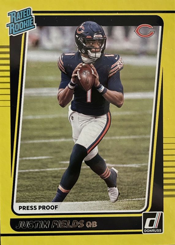 The Justin Fields 2021 Donruss #253 Press Proof Yellow Rookie card in Raw condition has moved up $9.00 (+900%) in the last 30 days and was last sold for $10.00 .