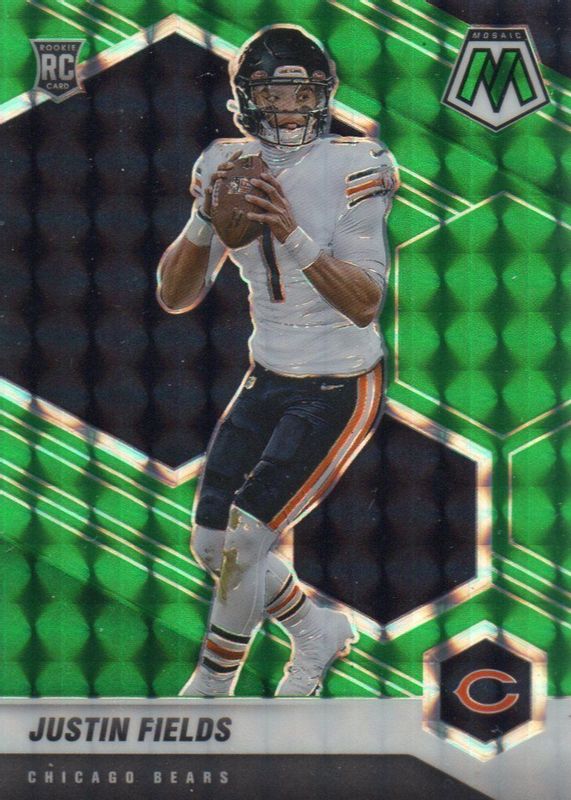 The Justin Fields 2021 Mosaic #304 Green Rookie card in Raw condition has moved up $7.00 (+707%) in the last 30 days and was last sold for $7.99 .