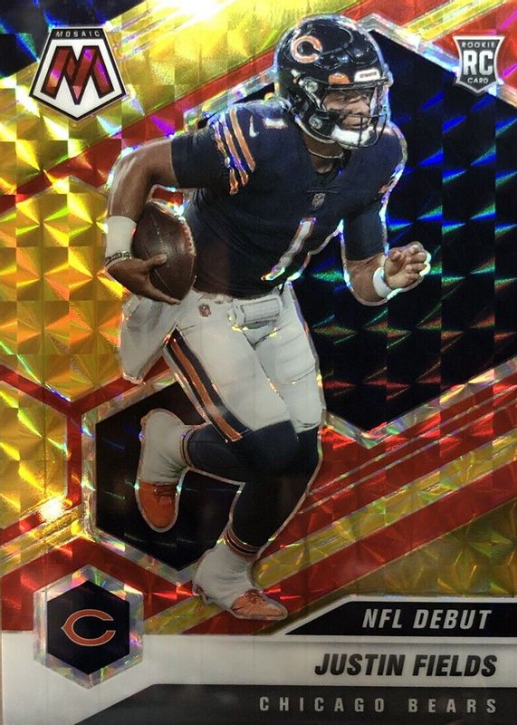 The Justin Fields 2021 Mosaic #242 NFL Debut - Choice Fusion Red & Yellow /80 Rookie card in Raw condition has not changed in price in the last 30 days and was last sold for $78.87 .