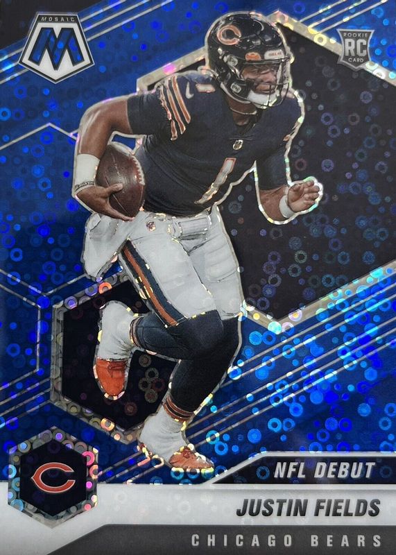 The Justin Fields 2021 Mosaic #242 NFL Debut - No Huddle Blue /75 Rookie card in Raw condition has not changed in price in the last 30 days and was last sold for $9.50 .