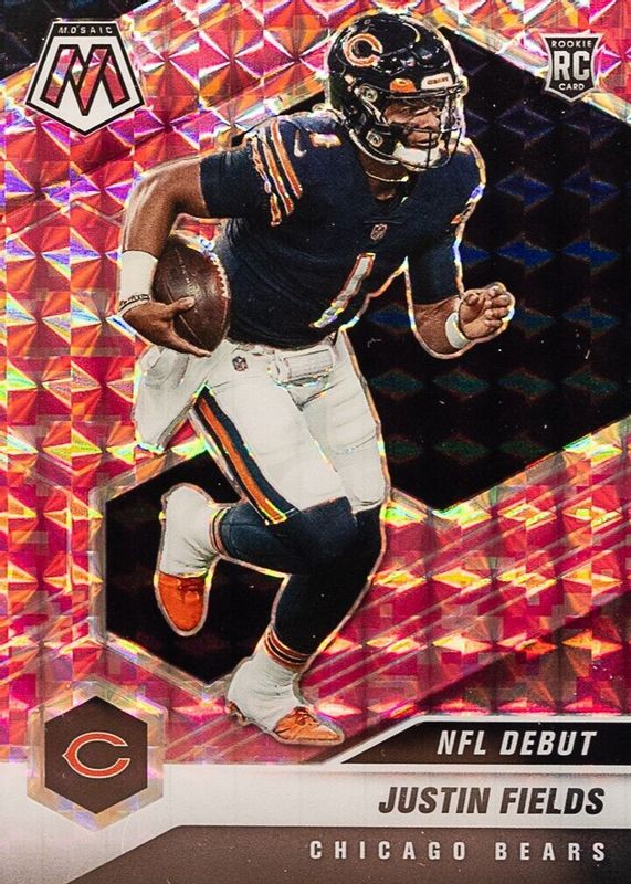 The Justin Fields 2021 Mosaic #242 NFL Debut - Pink Camo Rookie card in Raw condition has not changed in price in the last 30 days and was last sold for $2.25 .