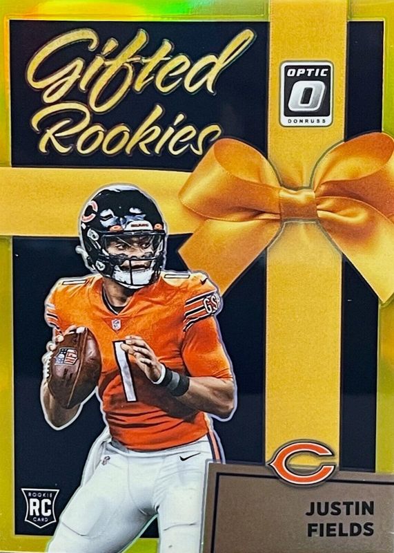 The Justin Fields 2021 Optic #GR-4 Gifted Rookies - Gold /10 card in Raw condition has not changed in price in the last 30 days and was last sold for $183.92 .