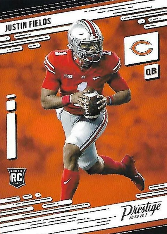 This card is 1 of 4 Justin Fields' card variations in the 2021 Prestige set being tracked by Sports Card Investor, including Season's Greetings, Rookie Portraits /(SSP), and State of the Art /(SSP).