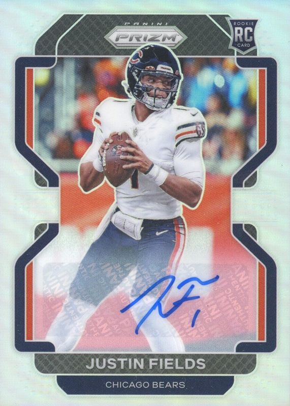 The Justin Fields 2021 Prizm #334 Rookie Autographs - Silver card in Raw condition has moved down -$7.00 (-11.3%) in the last 30 days and was last sold for $55.00 .