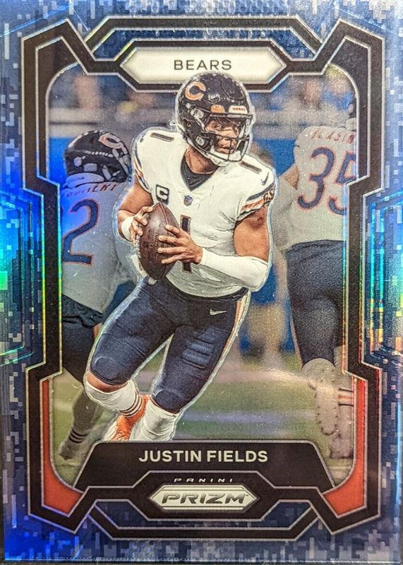 This card is 1 of 49 Justin Fields' card variations in the 2023 Prizm set being tracked by Sports Card Investor, including Blue Ice /99, Purple Wave /99, Blue Sparkle /96, No Huddle Blue /95, and Green Scope /75.