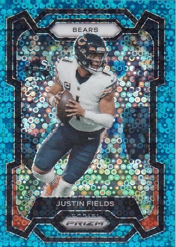 This card is 1 of 49 Justin Fields' card variations in the 2023 Prizm set being tracked by Sports Card Investor, including Blue Ice /99, Purple Wave /99, Blue Sparkle /96, Green Scope /75, and No Huddle Red /70.