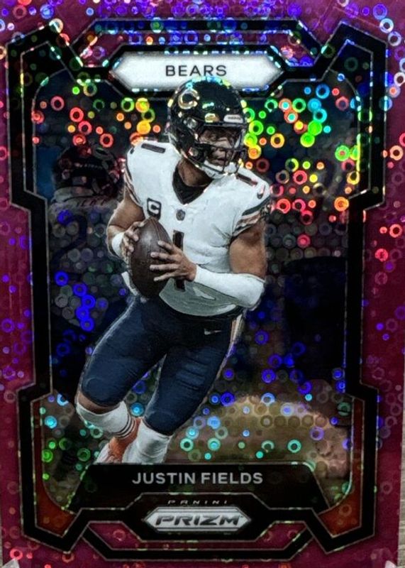 This card is 1 of 49 Justin Fields' card variations in the 2023 Prizm set being tracked by Sports Card Investor, including Blue Ice /99, Purple Wave /99, Blue Sparkle /96, No Huddle Blue /95, and Green Scope /75.