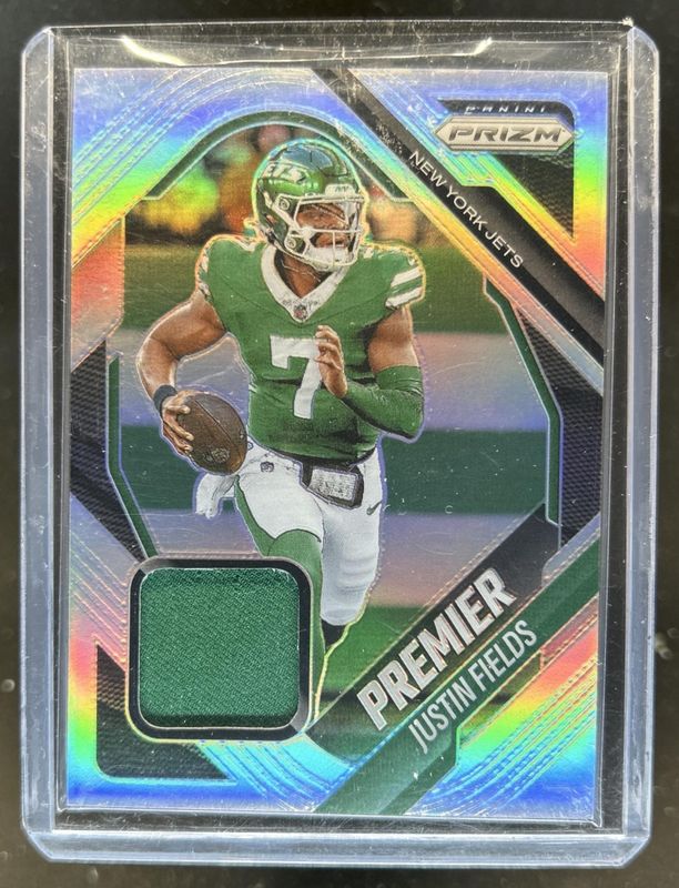 The Justin Fields 2025 Prizm #37 Premier Jerseys card is 1 of 76 Justin Fields' card variations in the 2025 Prizm set being tracked by Sports Card Investor, including Base, Choice Blue Yellow Green, Green Flash, Green Ice, and Green Wave.