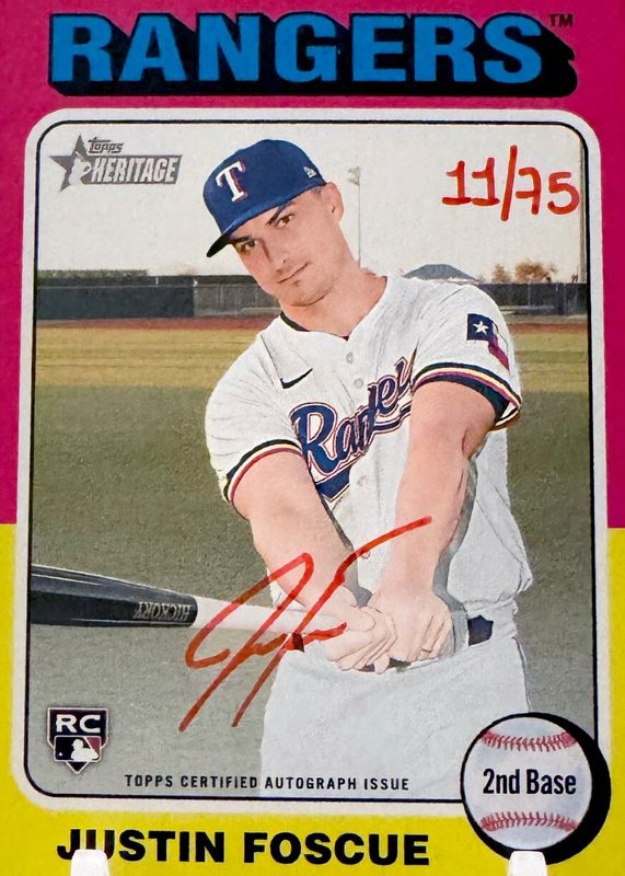 This card is 1 of 2 Justin Foscue's card variations in the 2024 Topps Heritage High Number set being tracked by Sports Card Investor, including Real One Autographs.