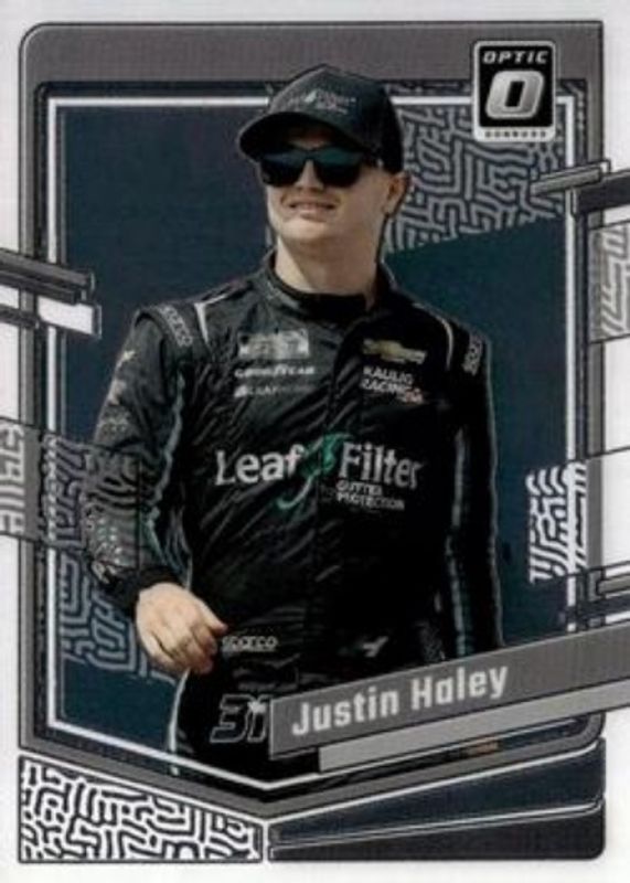 The Justin Haley 2024 Donruss NASCAR #38 Optic card is 1 of 44 Justin Haley's card variations in the 2024 Donruss NASCAR set being tracked by Sports Card Investor, including #38b Base, #38a Base, #38 Optic Black Pandora, #38 Optic Blue Velocity, and #38 Optic Holo.