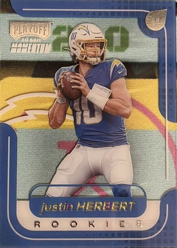 The Justin Herbert 2020 Chronicles #M-3 Playoff Momentum Rookie card in Raw condition has moved up $2.14 (+95.1%) in the last 30 days and was last sold for $4.39 .