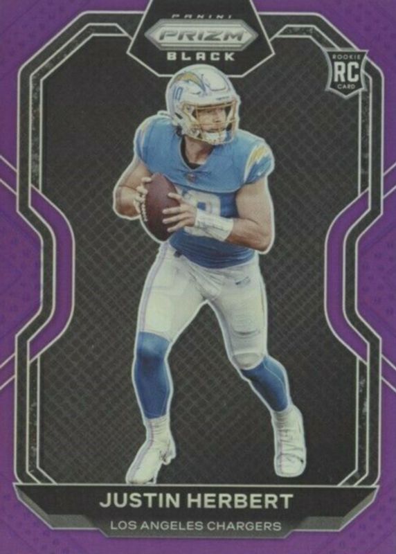 The Justin Herbert 2020 Chronicles #3 Prizm Black - Purple /125 Rookie card in Raw condition has not changed in price in the last 30 days and was last sold for $136.50 .