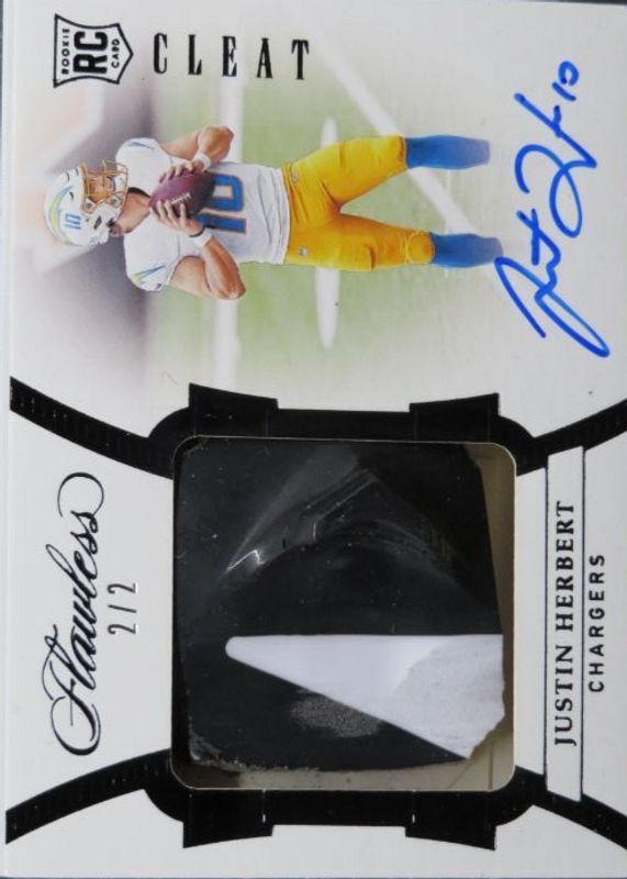 The Justin Herbert 2020 Flawless #RCA-JHE Rookie Cleat Autographs (/2) card in Raw condition has not changed in price in the last 30 days and was last sold for $1,913.00 .