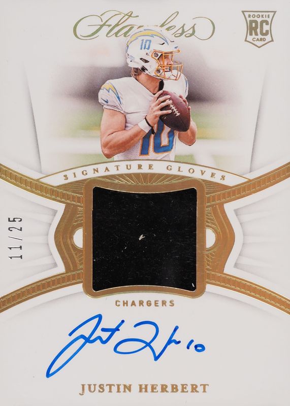 The Justin Herbert 2020 Flawless #SG-JHE Signature Gloves (/25) Rookie card in Raw condition has not changed in price in the last 30 days and was last sold for $2,760.00 .