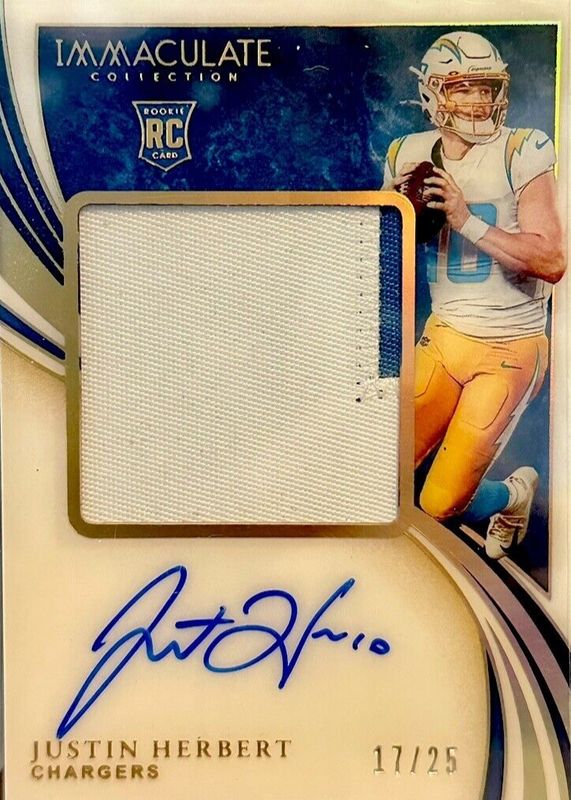 The Justin Herbert 2020 Immaculate #PPR-JHE Premium Patch Rookie Autographs - Gold /25 card in Raw condition has not changed in price in the last 30 days and was last sold for $1,325.00 .