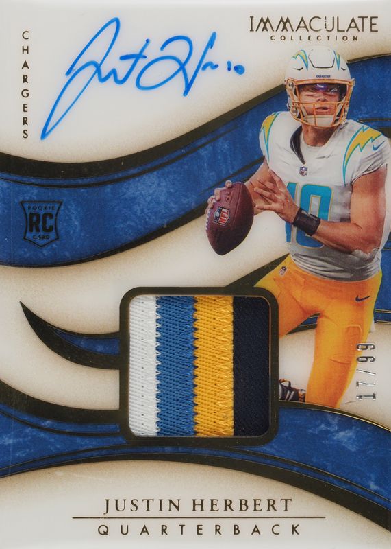 The Justin Herbert 2020 Immaculate #103 Rookie Patch Auto /99 card in Raw condition has not changed in price in the last 30 days and was last sold for $1,111.88 .