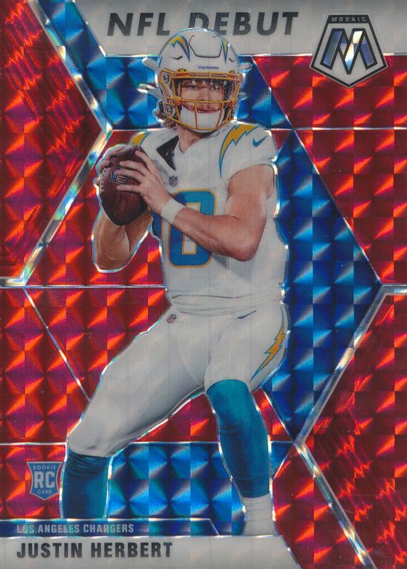 The Justin Herbert 2020 Mosaic #263 NFL Debut - Choice Fusion Red /80 Rookie card in Raw condition has not changed in price in the last 30 days and was last sold for $68.00 .