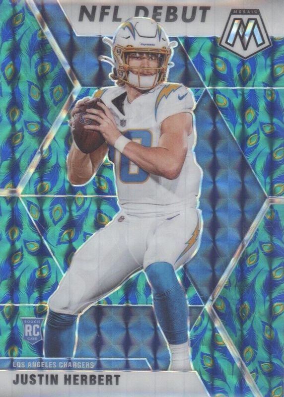 The Justin Herbert 2020 Mosaic #263 NFL Debut - Choice Peacock /(SSP) Rookie card in Raw condition has not changed in price in the last 30 days and was last sold for $404.00 .