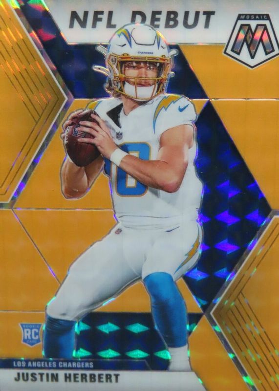 The Justin Herbert 2020 Mosaic #263 NFL Debut - Orange Fluorescent /25 Rookie card in Raw condition has not changed in price in the last 30 days and was last sold for $725.00 .