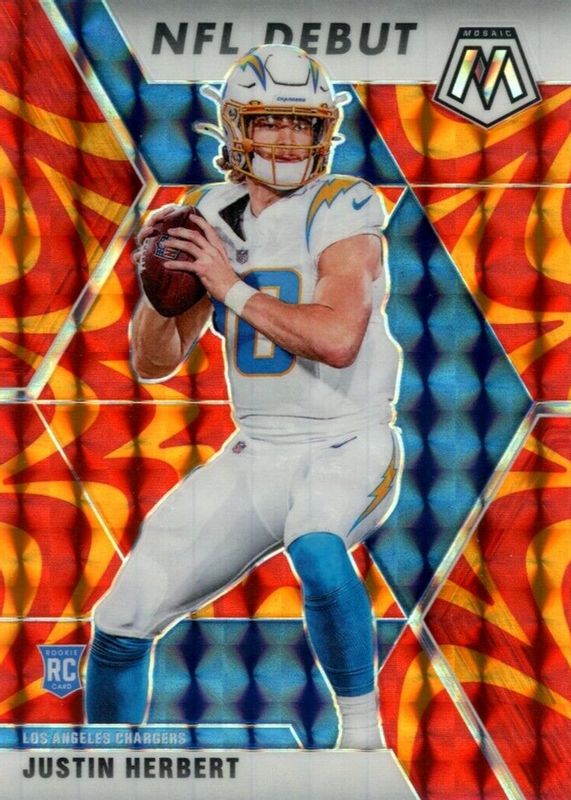 The Justin Herbert 2020 Mosaic #263 NFL Debut - Reactive Orange Rookie card in Raw condition has moved down -$7.50 (-50.0%) in the last 30 days and was last sold for $7.50 .