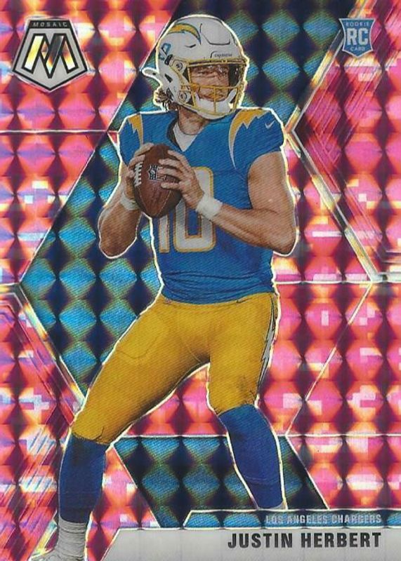 The Justin Herbert 2020 Mosaic #204 Pink Camo Rookie card in Raw condition has moved down -$3.50 (-17.5%) in the last 30 days and was last sold for $16.50 .