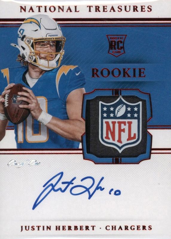 This card is 1 of 49 Justin Herbert's card variations in the 2020 National Treasures set being tracked by Sports Card Investor, including Rookie Patch Auto /99, Rookie Patch Auto - Green Jersey Number (/10), Rookie Patch Auto - Holo Silver /25, Rookie Patch Auto - Midnight /20, and Rookie Patch Auto - Stars & Stripes /20.