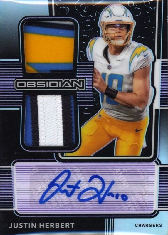 The Justin Herbert 2020 Obsidian #RJI-4 Rookie Jersey Ink - Electric Etch Purple (/40) card in Raw condition has not changed in price in the last 30 days and was last sold for $355.00 .