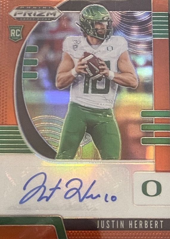This card is 1 of 51 Justin Herbert's card variations in the 2020 Prizm Draft Picks set being tracked by Sports Card Investor, including Base, Blue, Green, Orange, and Pink Pulsar.