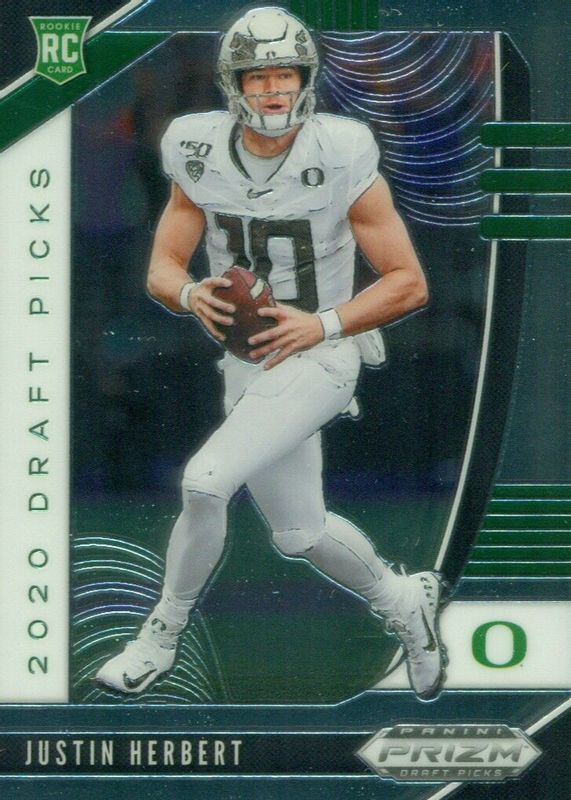 The Justin Herbert 2020 Prizm Draft Picks #102 Base Rookie card in Raw condition has moved up $9.00 (+360%) in the last 30 days and was last sold for $11.50 .