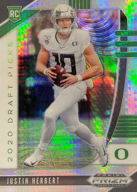 This card is 1 of 51 Justin Herbert's card variations in the 2020 Prizm Draft Picks set being tracked by Sports Card Investor, including Base, Blue, Green, Orange, and Pink Pulsar.