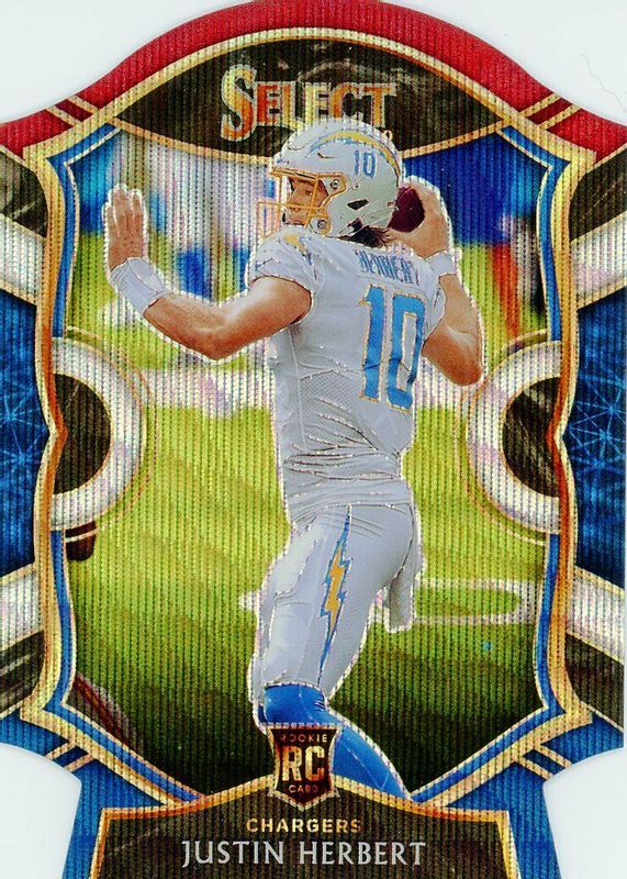The Justin Herbert 2020 Select #44 Concourse Tri-Color Die-Cut Rookie card in Raw condition has moved down -$5.44 (-35.2%) in the last 30 days and was last sold for $10.00 .