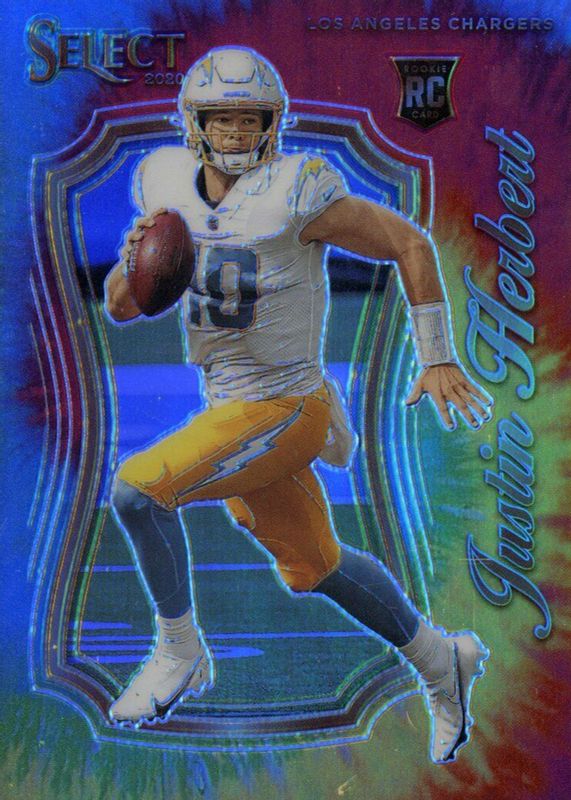 The Justin Herbert 2020 Select #4 Select Certified Rookies - Tie-Dye /25 card in Raw condition has not changed in price in the last 30 days and was last sold for $344.00 .