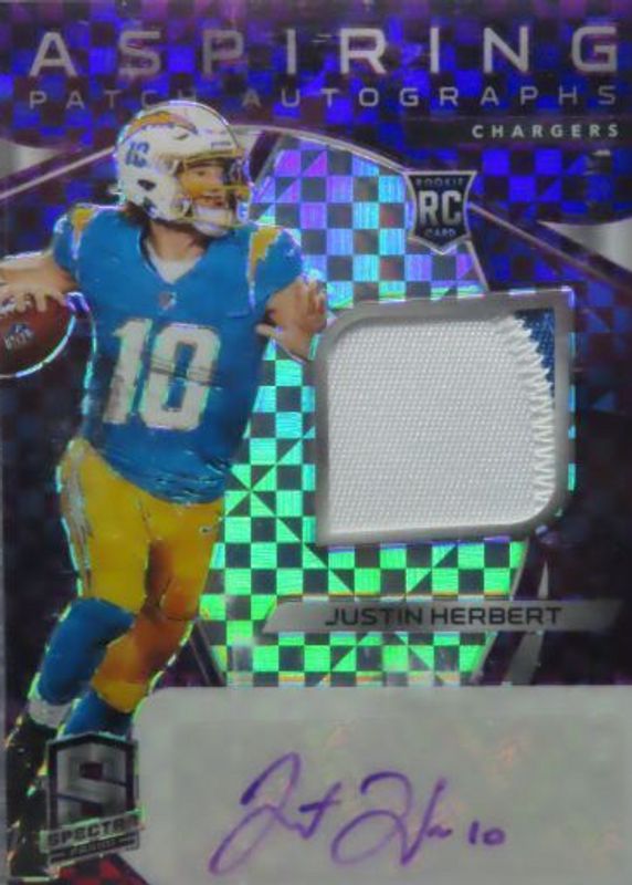 The Justin Herbert 2020 Spectra #2 Aspiring Patch Autographs - Neon Purple (/15) Rookie card in Raw condition has not changed in price in the last 30 days.