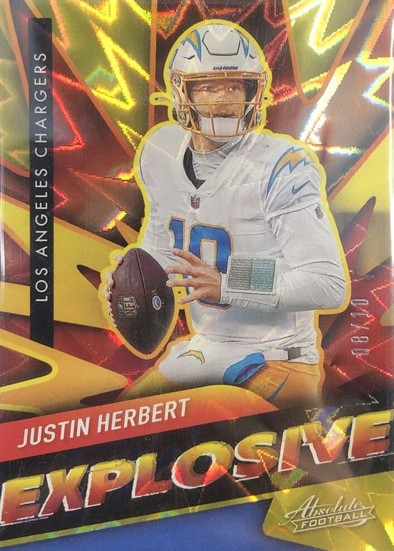 The Justin Herbert 2021 Absolute #E27 Explosive - Gold /10 card in Raw condition has not changed in price in the last 30 days and was last sold for $455.00 .
