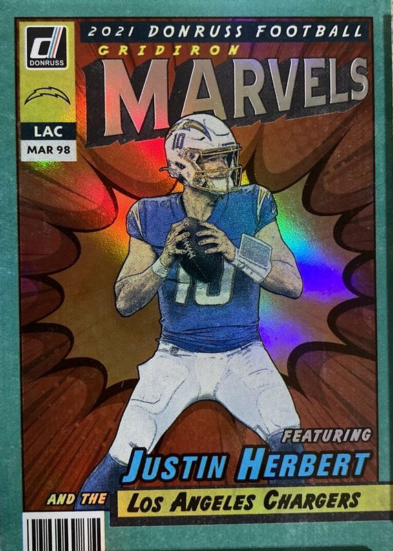 The Justin Herbert 2021 Donruss #GM-JHE Gridiron Marvels /(SSP) card in Raw condition has not changed in price in the last 30 days and was last sold for $118.50 .