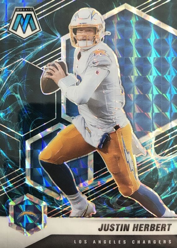 This card is 1 of 30 Justin Herbert's card variations in the 2021 Mosaic set being tracked by Sports Card Investor, including Silver, Blue /99, Choice Fusion Red & Yellow /80, No Huddle Blue /75, and Choice Peacock /(SSP).