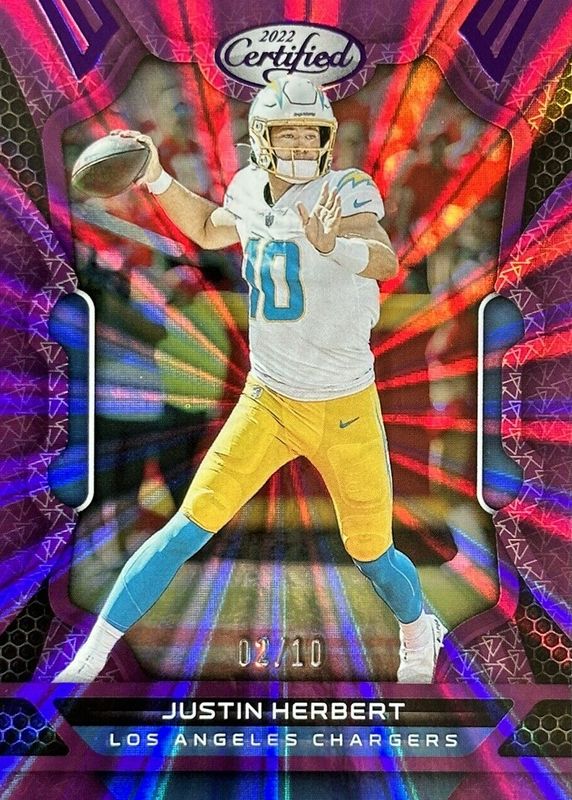 The Justin Herbert 2022 Certified #50 FOTL Mirror Purple /10 card in Raw condition has not changed in price in the last 30 days and was last sold for $70.00 .