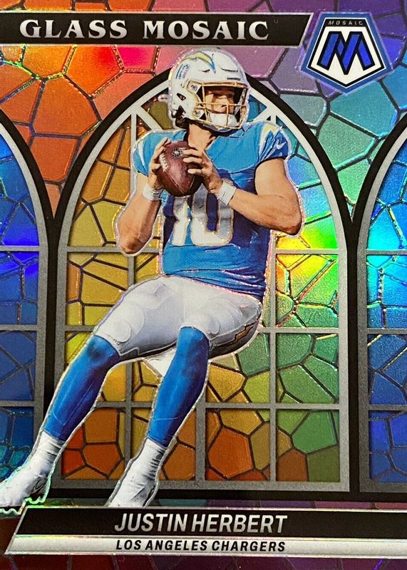 The Justin Herbert 2022 Mosaic #GM-2 Glass Mosaic /(SSP) card in Raw condition has moved down -$14.00 (-13.3%) in the last 30 days and was last sold for $91.00 .