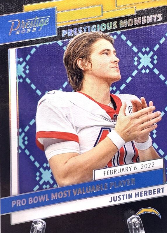 The Justin Herbert 2022 Prestige #PM-12 Prestigious Moments /(SSP) card in Raw condition has not changed in price in the last 30 days and was last sold for $45.00 .
