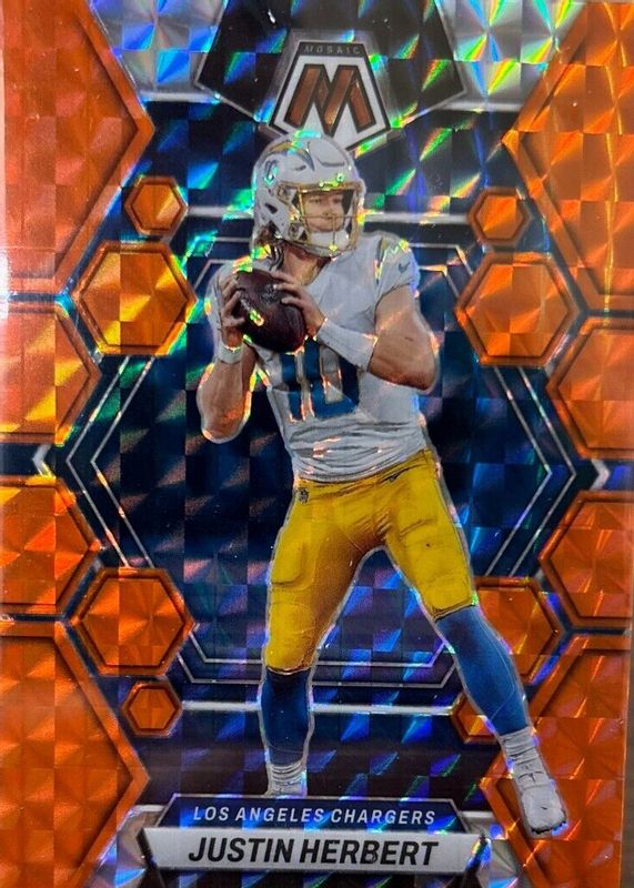 The Justin Herbert 2023 Mosaic #127 Orange /199 card in Raw condition has moved up $7.21 (+403%) in the last 30 days and was last sold for $9.00 .
