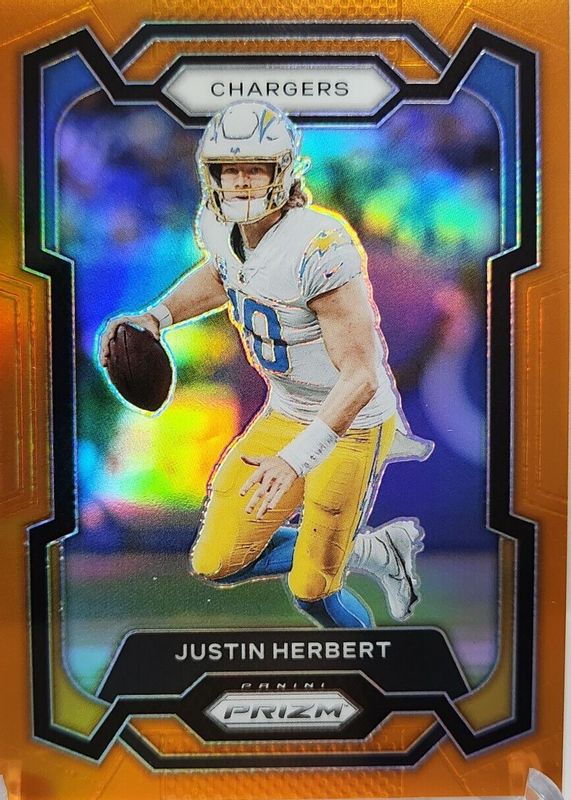 The Justin Herbert 2023 Prizm #158 Orange /249 card in Raw condition has moved down -$10.50 (-47.7%) in the last 30 days and was last sold for $11.50 .