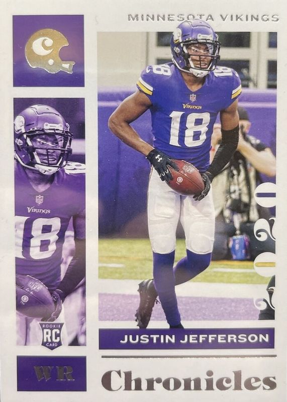 The Justin Jefferson 2020 Chronicles #62 Base Rookie card in Raw condition has moved down -$0.50 (-25.1%) in the last 30 days and was last sold for $1.49 .