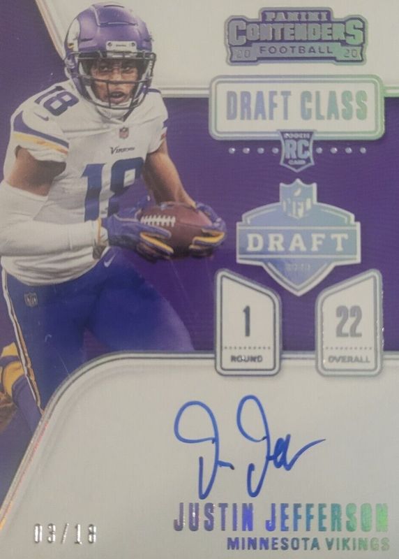 The Justin Jefferson 2020 Contenders #DC-JUJ Draft Class Autographs (/18) Rookie card in Raw condition has not changed in price in the last 30 days and was last sold for $204.16 .