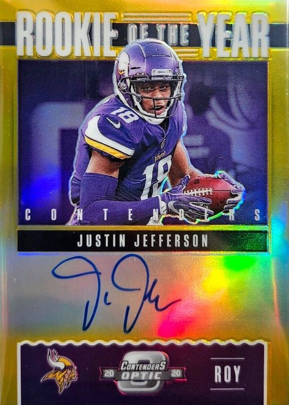 The Justin Jefferson 2020 Contenders Optic #ROY2 Rookie of the Year Contenders Autographs - Gold /10 card in Raw condition has not changed in price in the last 30 days and was last sold for $898.88 .