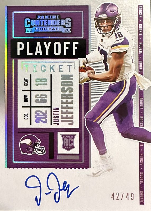 Justin Jefferson 2020 Contenders #109 Rookie Ticket Auto Variation - Playoff Ticket /49 RAW Price Guide