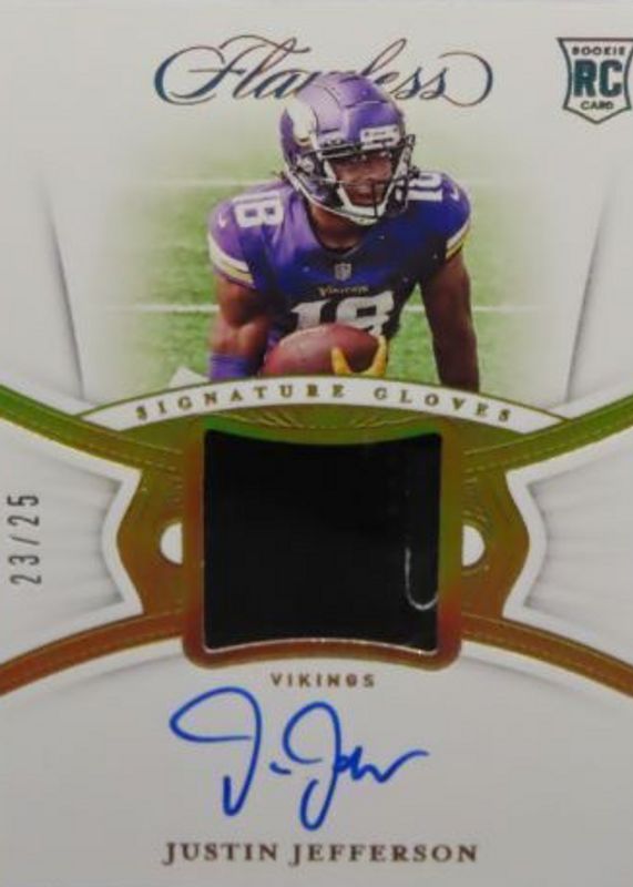 The Justin Jefferson 2020 Flawless #SG-JJE Signature Gloves (/25) Rookie card in Raw condition has not changed in price in the last 30 days and was last sold for $750.00 .