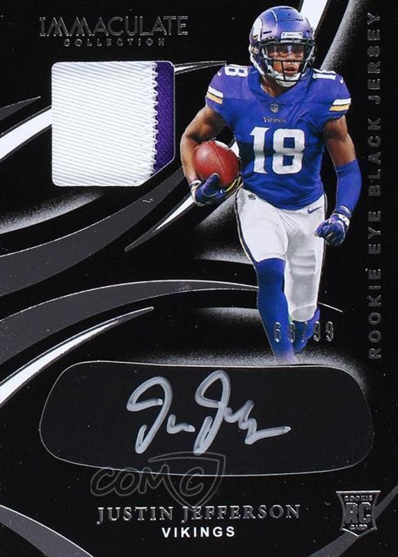 The Justin Jefferson 2020 Immaculate #REB-18 Immaculate Rookie Eye Black Jersey Autographs (/99) card in Raw condition has not changed in price in the last 30 days and was last sold for $232.50 .